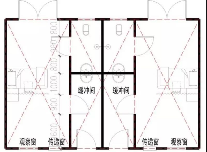按照传染病医院要求,分不同洁净污染区域。病区双走廊设计,病房设置传递窗,用于一般物品传送。医护区域设置两次卫生缓冲区、穿脱防护用品区和洁净通道。