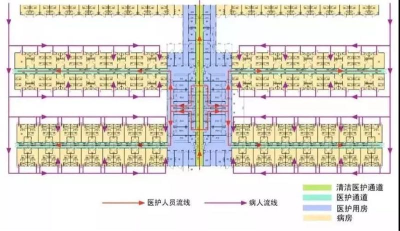 见下图,清洁区与污染区之间要有过渡区域。正中央竖直的通道是清洁医护通道。两侧横向的通道是一般医护通道。内部红色的箭头是医护人员的流线,外部紫色的箭头是病人的流线,二者没有交叉。